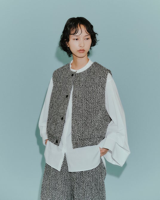 ツイードベスト¥33,000 スリーブタックブラウス¥19,800 ツイードタックフォルムパンツ¥26,400