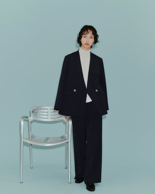 フェイクレイヤードウールジャケット¥36,300 ツータックウールイージーパンツ¥23,100 ニット¥19,800 (CAST:) (全て税込価格)