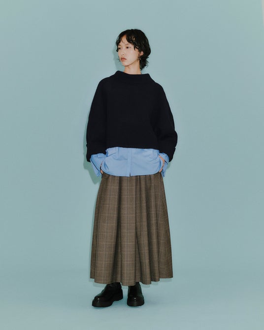 2WAYニットポンチョ¥26,400(「CAST:」11/1展開)スリーブタックブラウス ¥19,800 タックギャザーチェックスカート¥26,400