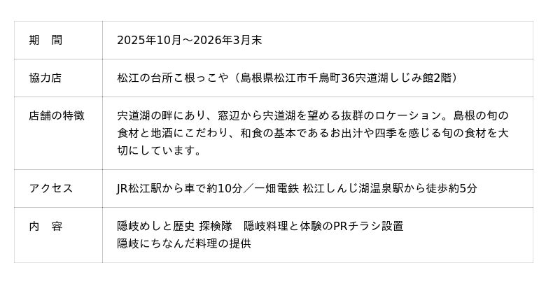 <隠岐めしと歴史 探検隊 隠岐料理と体験のPRチラシ設置/隠岐にちなんだ料理の提供 概要>