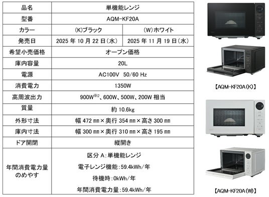 アクア株式会社(本社:東京都中央区、代表取締役社長 兼 CEO:杜 鏡国)は、AQUA独自の解凍プログラム『四ツ星解凍』を搭載した単機能レンジ「四ツ星レンジ」の最新モデル(品番:AQM-KF20A)を、2025年10月22日(水)より順次発売します。