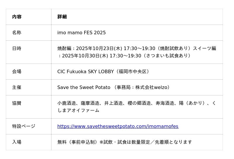 農園芸のイノベーションカンパニーwelzo(本社:福岡市博多区、代表取締役社長:金尾佳文)が主導する産学連携コンソーシアム「みんなのサツマイモを守るプロジェクトSave the Sweet Potato(SSP)」は、10月23日(木)および10月30日(木)の2日間にわたり、昨年に引き続き「imo mamo FES 2025」をVenture Cafe Fukuoka(福岡市)にて開催いたします。
