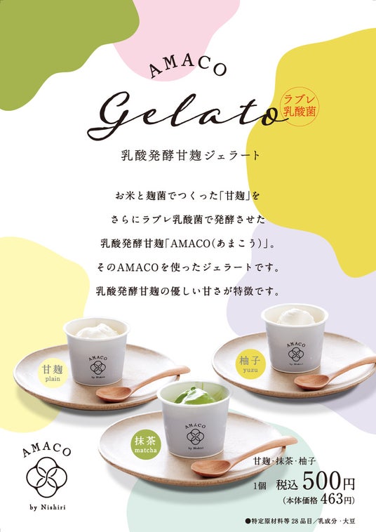 株式会社西利(本社:京都市下京区)が展開する発酵甘麹ブランド「AMACO(あまこう)」は、2025年10月より新商品「乳酸発酵甘麹gelato」を京都市内の一部直営店舗にて先行販売しております。「乳酸発酵甘麹AMACO」(※)を使用した、やさしい甘さと発酵の風味が楽しめる3種の新スイーツです。