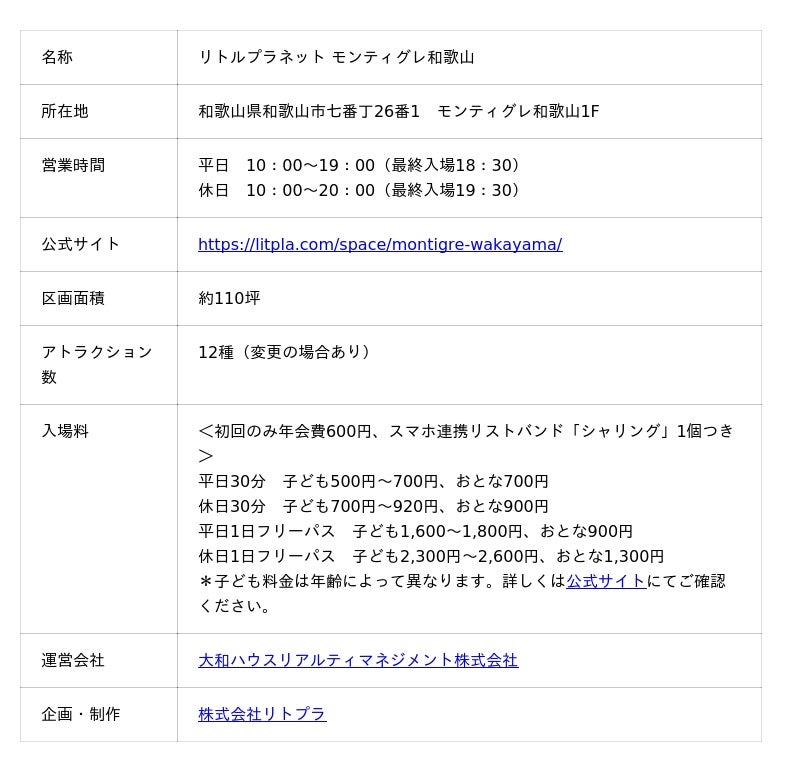 当パークは、大和ハウスリアルティマネジメント株式会社との「リトルプラネット」のライセンスパートナーシップのもとに展開するライセンスアウト型店舗です。同社は商業施設「モンティグレ和歌山」の運営会社です。
