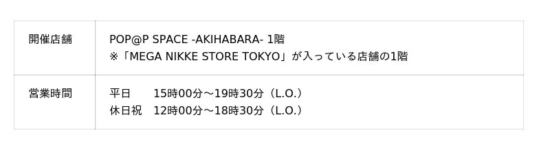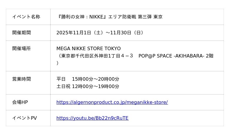 株式会社アルジャーノンプロダクト(本社:東京都台東区)は、2025年11月1日(土)からMEGA NIKKE STORE TOKYOにて全国6都市を巡るPOP UPイベント「『勝利の女神:NIKKE』エリア防衛戦 第三弾」を実施することを発表いたしました。