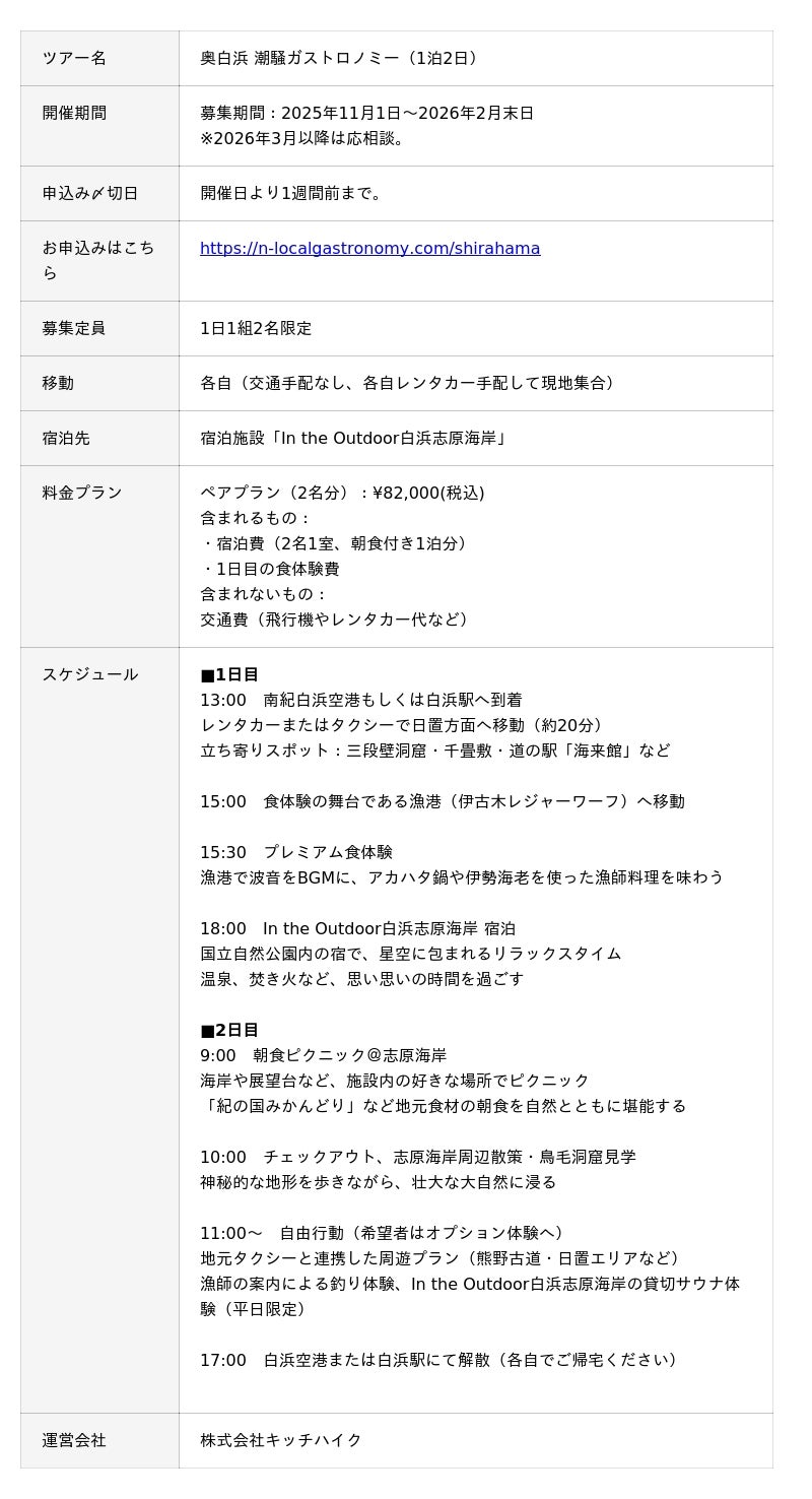 「地域の価値を拡充し、地球の未来へつなぐ。」をミッションに掲げる株式会社キッチハイク(本社:東京都台東区、代表取締役CEO:山本雅也)は、和歌山県白浜町(町長:大江康弘/以下、白浜町)と連携し、「奥白浜 潮騒ガストロノミー」ツーリズムを販売開始いたしました。