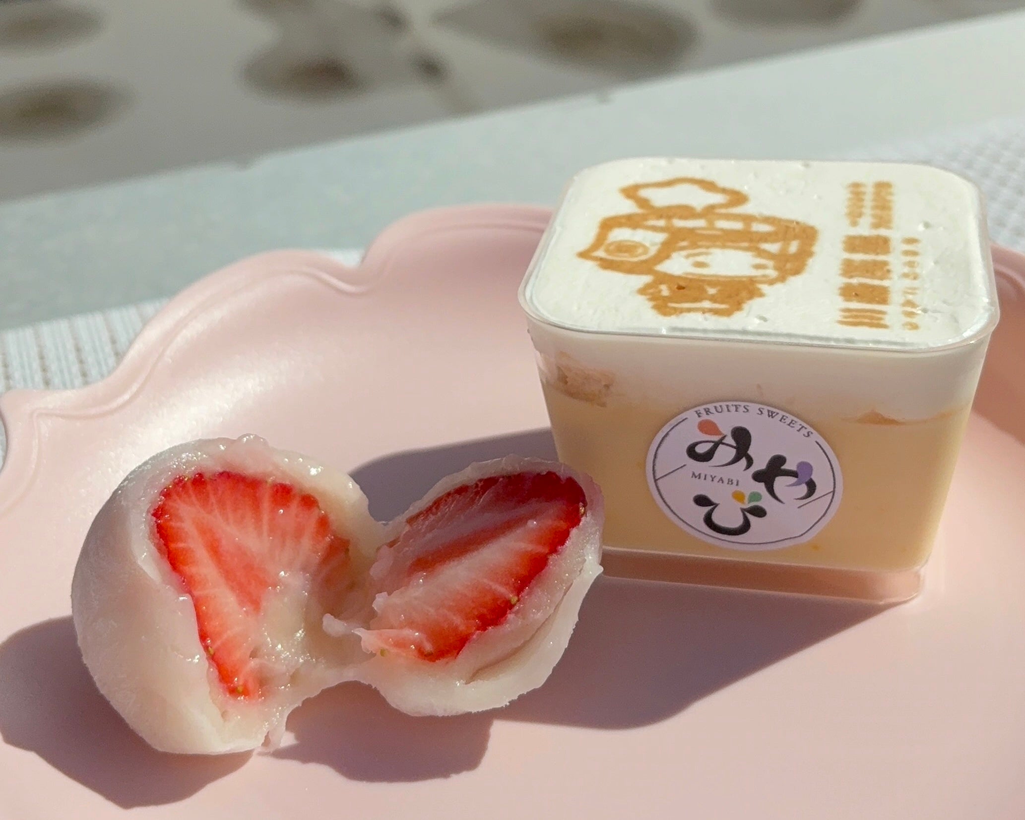【フルーツスイーツ店みやび 権三くんのなめらかプリンといちご大福】