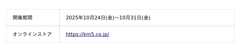 また、創業5周年の感謝を込めて、10月24日(金)~10月31日(金)の1週間、km5オンラインストアで初の創業5周年セールを実施します。セールの詳細は、弊社オンラインストアで後日ご案内いたします。ぜひこの機会に、km5の製品をご体験ください。