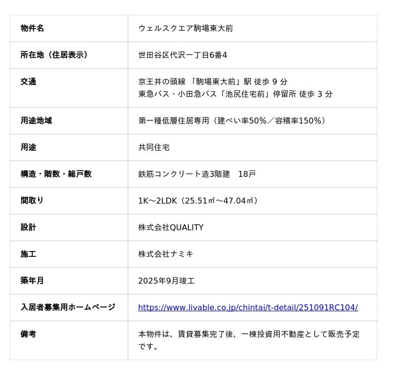 東急リバブル株式会社(代表取締役社長:小林俊一、本社:東京都渋谷区)は、世田谷区代沢一丁目において"大切な家族(ペット)との自由なくらしをウェルスクエアで"を開発スローガンとし、ペットとの共生をコンセプトとした一棟投資用不動産「ウェルスクエア駒場東大前」(以下、「本物件」という。)が竣工したことをお知らせいたします。なお、本物件は、2025年10月16日(木)より入居者の募集を開始しました。