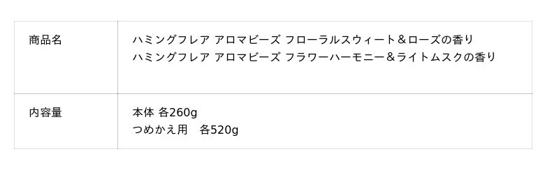 左から「ハミングフレア アロマビーズ フローラルスウィート&ローズの香り(本体260g)」、「ハミングフレア アロマビーズ フラワーハーモニー&ライトムスクの香り(本体260g)」