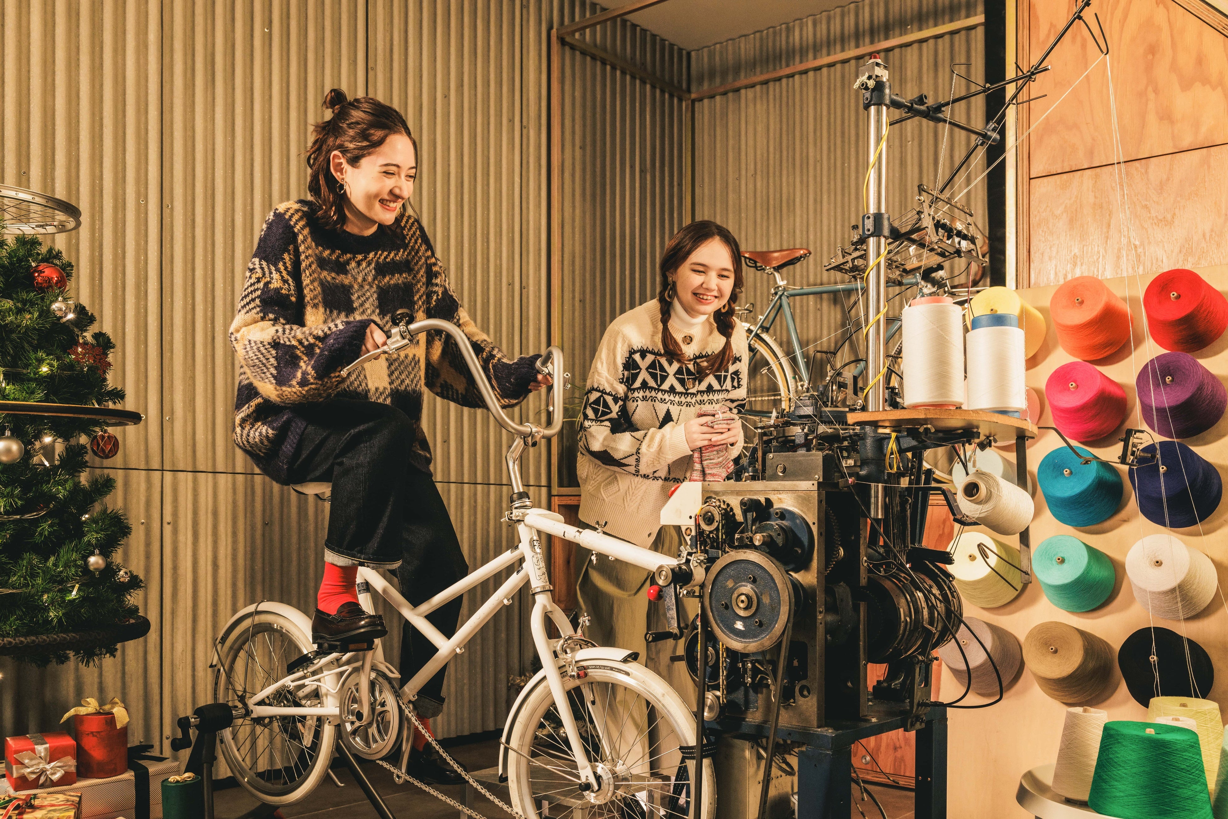 自転車をこいで靴下をつくるマシーン「チャリックス by SOUKI」が「TAMARIBA」に登場。「チャリックス」は、今は使われなくなった靴下の編機をアップサイクルし、自転車と融合させた機械です。機械だけではなく、靴下を編む糸もアップサイクルで染められたものを使用します。茨城県を拠点に活動する「futashiba248(フタシバ)」がつくる、農業廃棄物から抽出された染液で染められた糸を使って靴下づくりを体験することができます。完成した靴下を寝る前にドアノブにかけて眠りにつくと、翌朝サンタさんからささやかなプレゼントが届いているかも...?