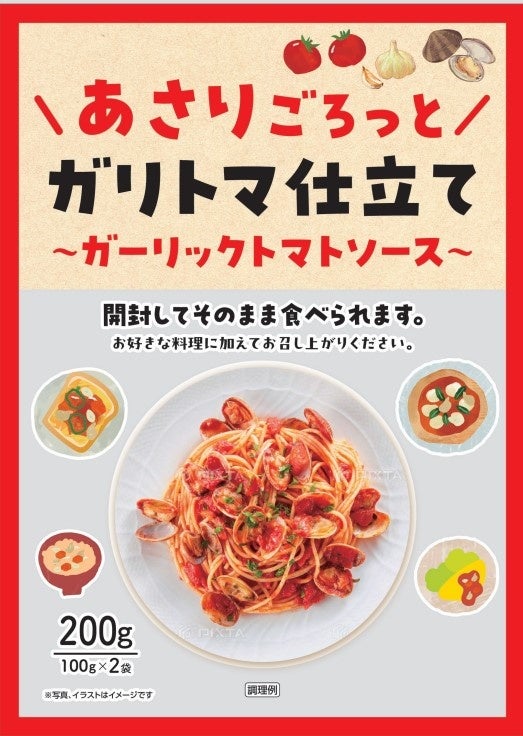 このたび発売する「あさりごろっと ガリトマ仕立て」は、むき身のあさりが入ったトマトソースです。あさりの旨味とガーリックトマトの風味が調和した味わいで、そのままでも美味しく食べられ、パスタやオムライス、トースト、ピザなど、様々な料理のアレンジにもご利用できます。時間がないときにも、温めてかけるだけ、混ぜるだけで美味しい一品ができます。