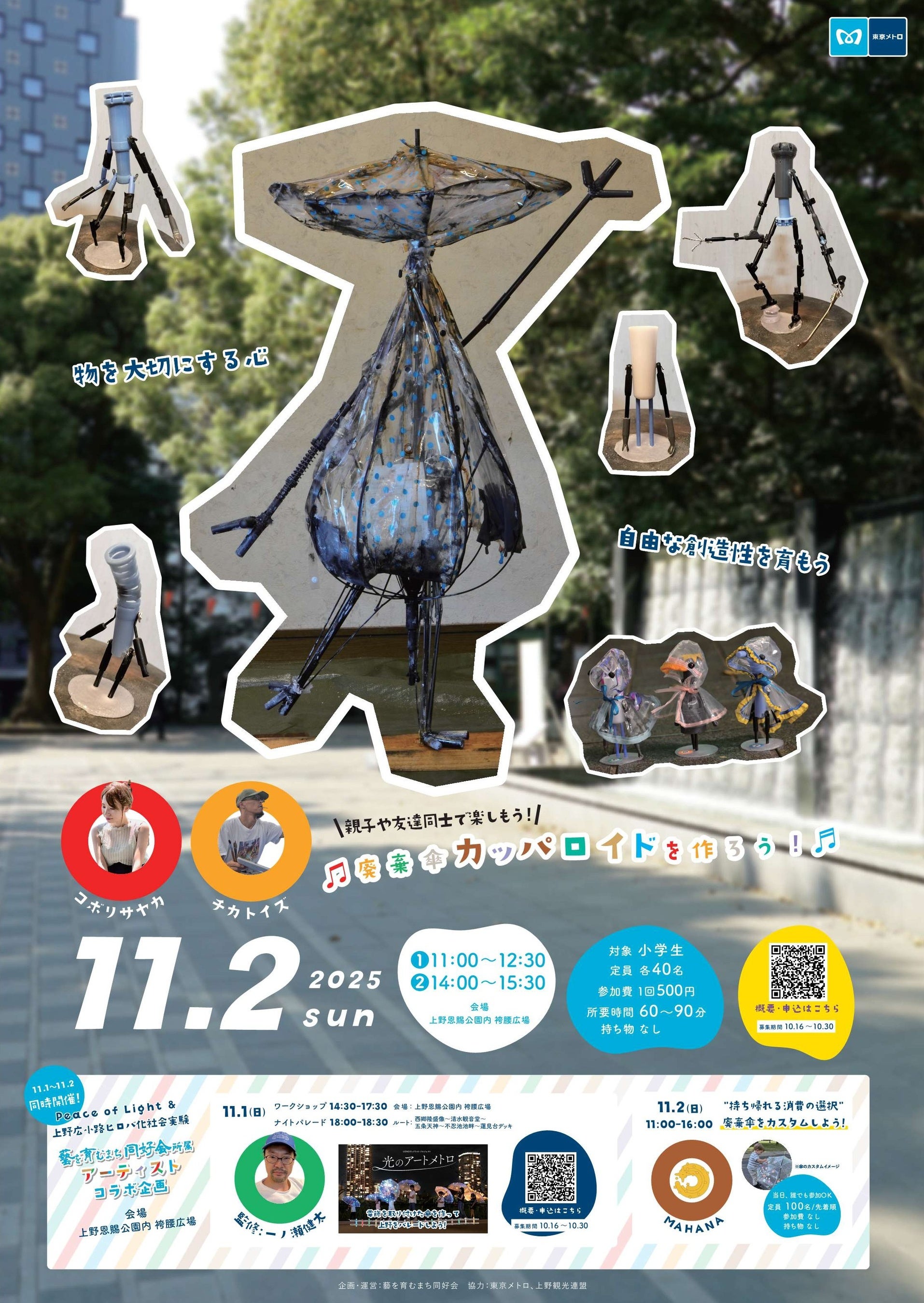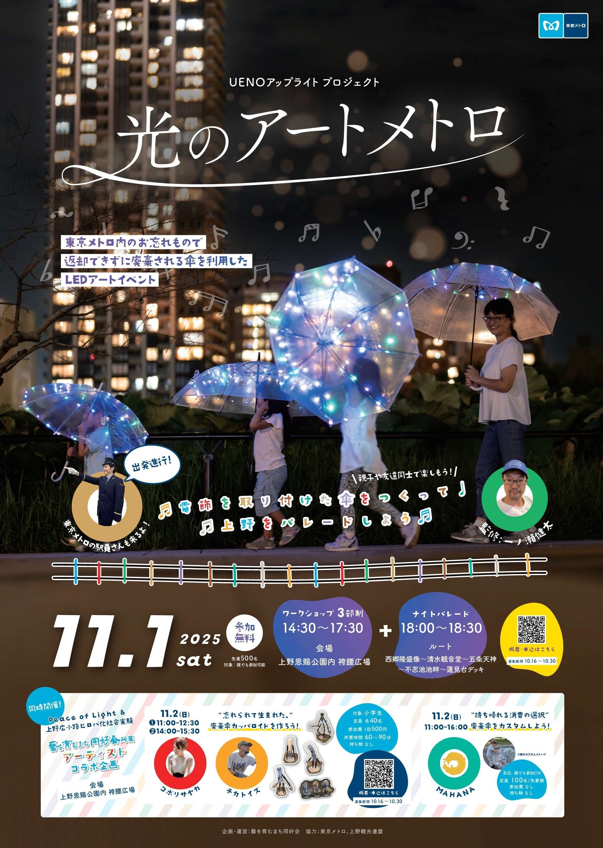 東京地下鉄株式会社(本社:東京都台東区、代表取締役社長:小坂 彰洋、以下「東京メトロ」)は、11月1日(土)に一般社団法人上野観光連盟(理事長:長岡信裕)が主催する「Peace of Light(ピースオブライト)」と11月2日(日)に上野まちづくり協議会(会長:佐藤一也)が主催する「上野広小路ヒロバ化社会実験」にて、東京メトロ内の遺失物として廃棄予定だったビニール傘を題材にしたワークショップを、藝を育むまち同好会(代表理事:山田勇魚、以下「藝育会」)と共に開催します。