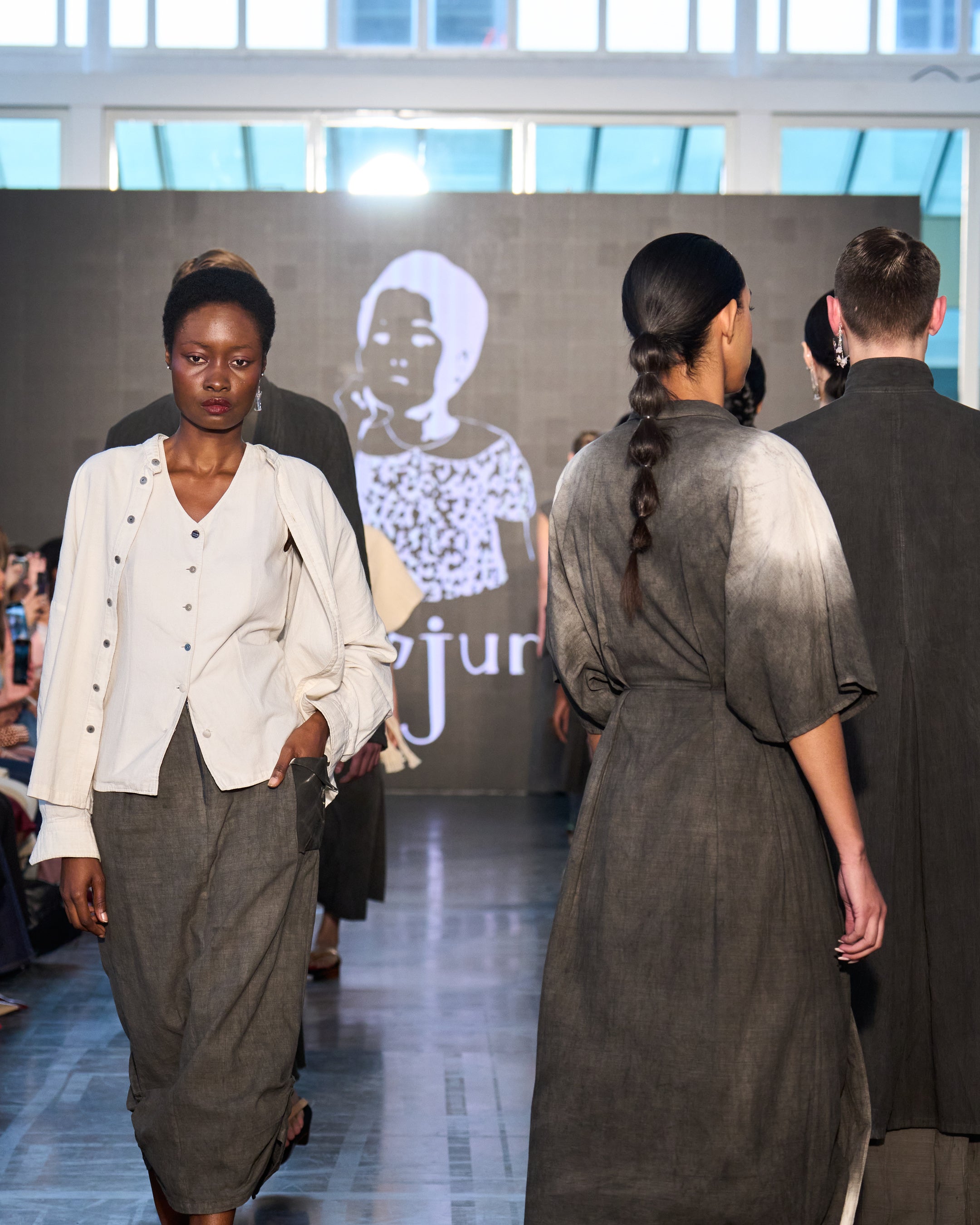 コレクションのタイトルは「Light and Shadow(光と影)」です。保多織の微妙な凹凸は、光を受けると立体的な陰影を生み出し、生地に生き生きとした表情を与えます。このコレクションでは、日本の伝統的な書道で使われる墨を使って生地を染め、水墨画のような奥深さと静けさを持つ衣服に仕上げています 。さらに、もう一つの伝統工芸である漆(うるし)の技法を用いて特別に作られたボタンが衣服を飾り、静かな品格を添えています。シルエットは、日本の伝統的な衣装のニュアンスとクラシックなファッションのエレガンスを融合させ、着る人の落ち着きと優雅さを引き立てます。このコレクションは、光と影の間に生まれるはかない詩的な美しさを捉え、綿密な手作業から生まれる静謐なエレガンスと共鳴します。
