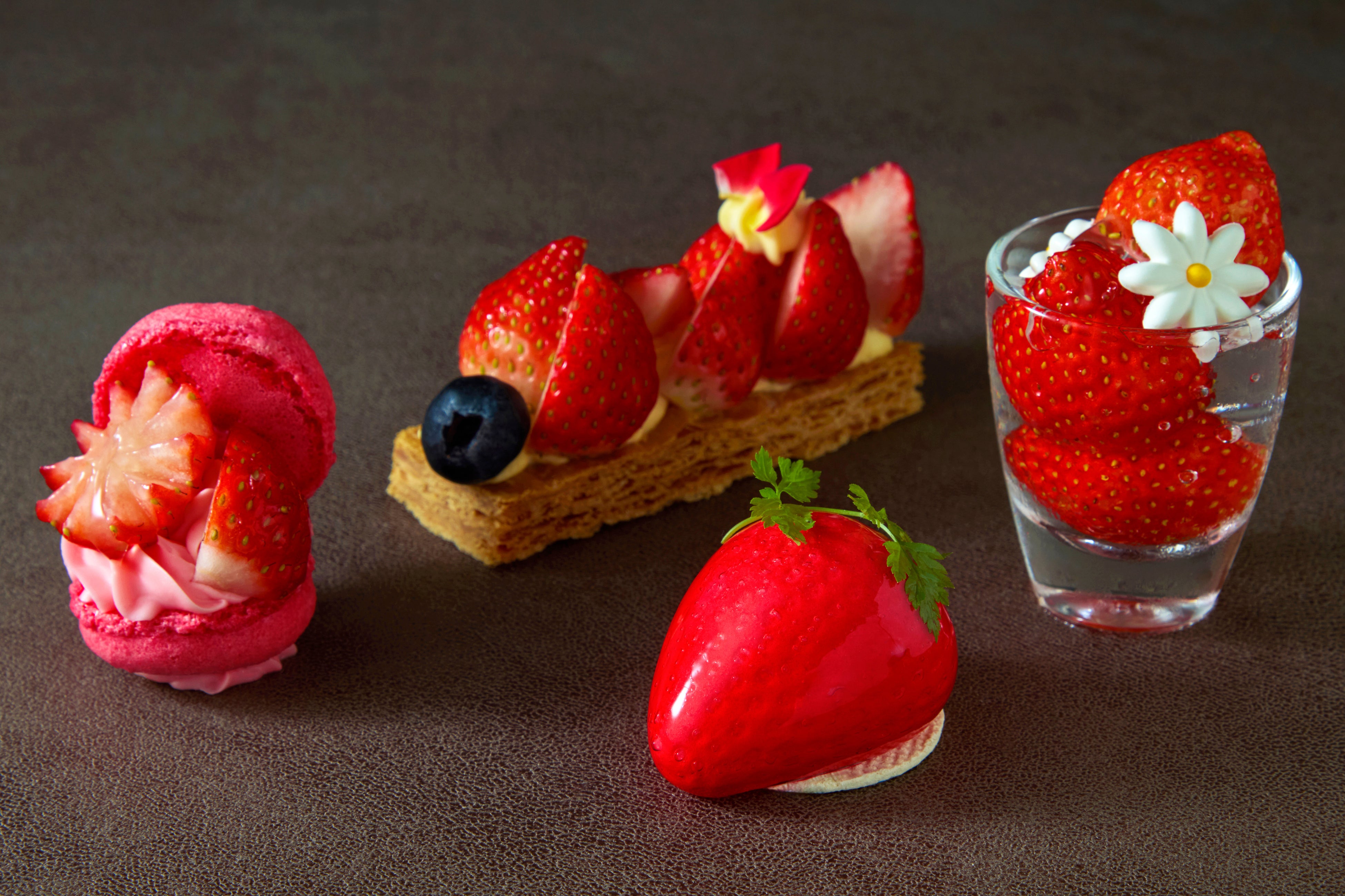 左から いちごのマカロン、いちごパイ、いちごそっくりムース、いちごグラスジュレ
