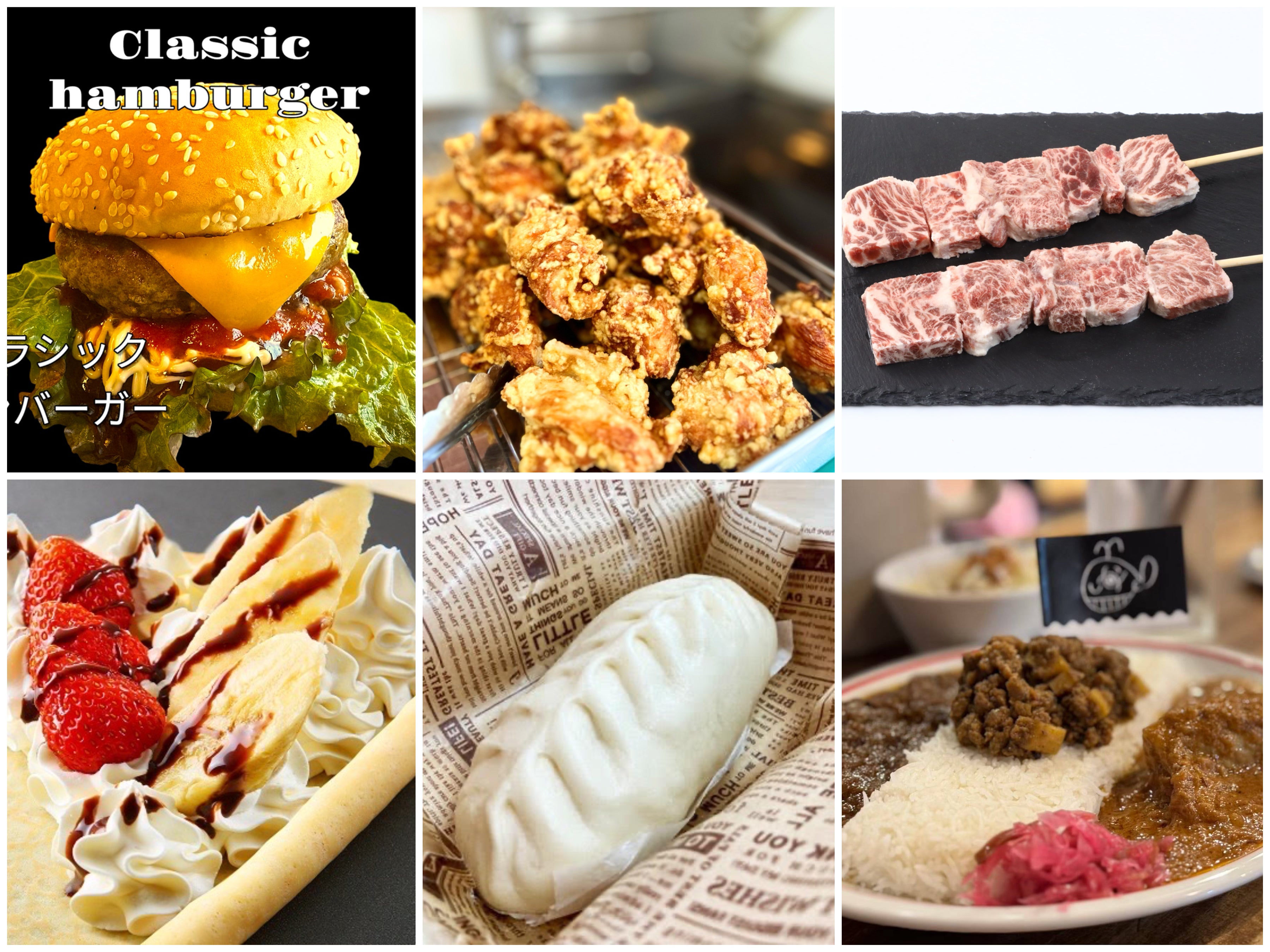 たこ焼き、牛串、ハンバーガー、からあげなどはもちろんクレープなどスイーツ系など、