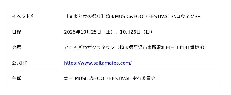 FoodFes株式会社(代表取締役社長:稲垣一馬)は、2025年10月25日(土)、10月26日(日)に埼玉県所沢市で開催される「【音楽と食の祭典】埼玉MUSIC&FOOD FESTIVAL ハロウィンSP」にてフードエリアプロデュースを担当します。