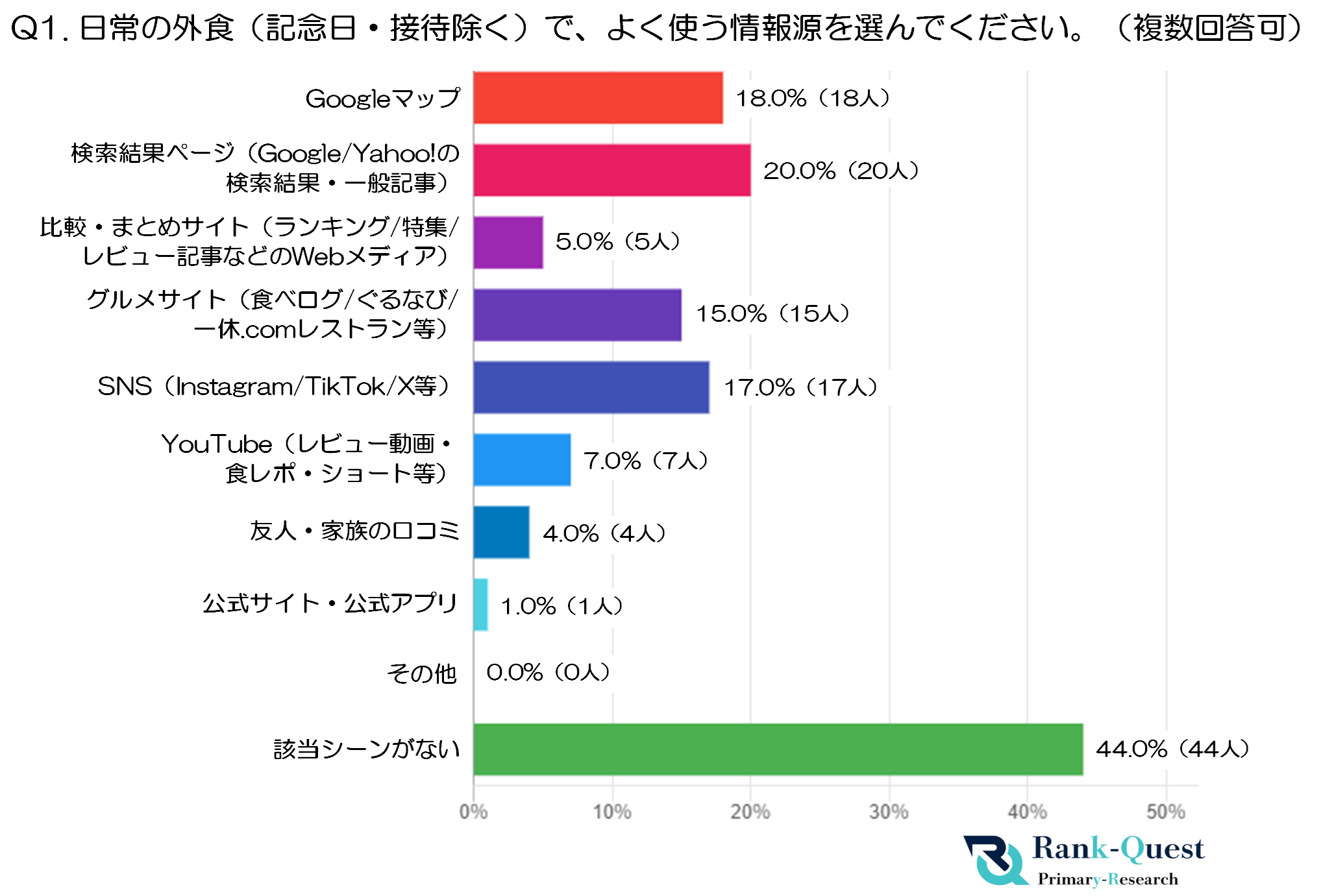 そこで、SEO対策支援実績4,300社を誇るランクエスト(https://rank-quest.jp/column/column/how-to-seo/ )は、20代男女100名を対象にアンケートを実施しました。飲食店を探す際の情報源やサービスの利用傾向、来店の決め手、検索方法の特徴までを多角的に分析し、20代の外食行動を可視化しています。
