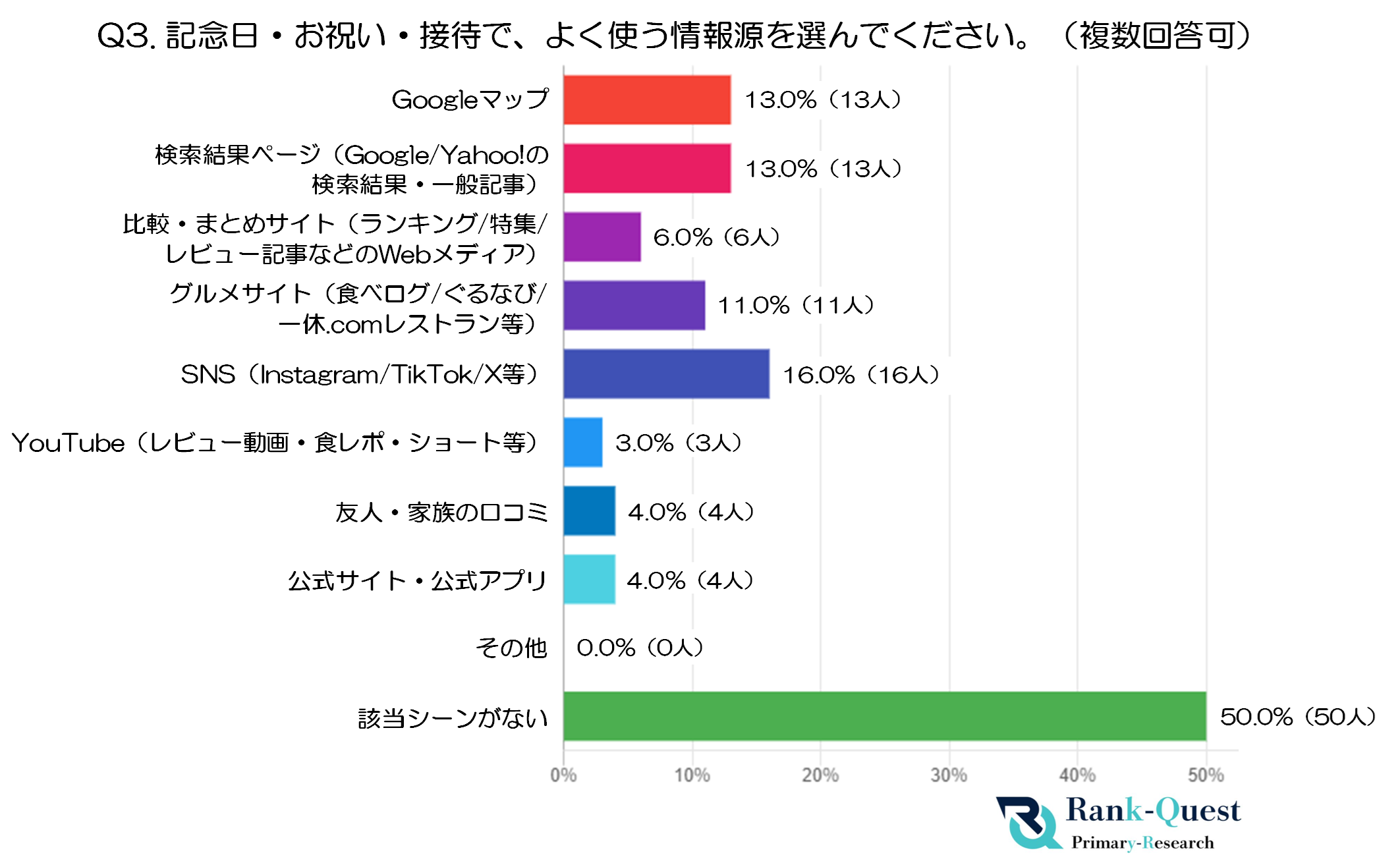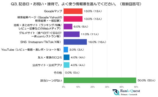 - 「該当シーンがない」以外で、最も多かったのは「SNS(Instagram/TikTok/X等)」で16.0%(16人)でした。記念日や接待といった特別なシーンでは、写真や動画を通じて雰囲気を直感的に確認できるSNSが重視されることがうかがえます。