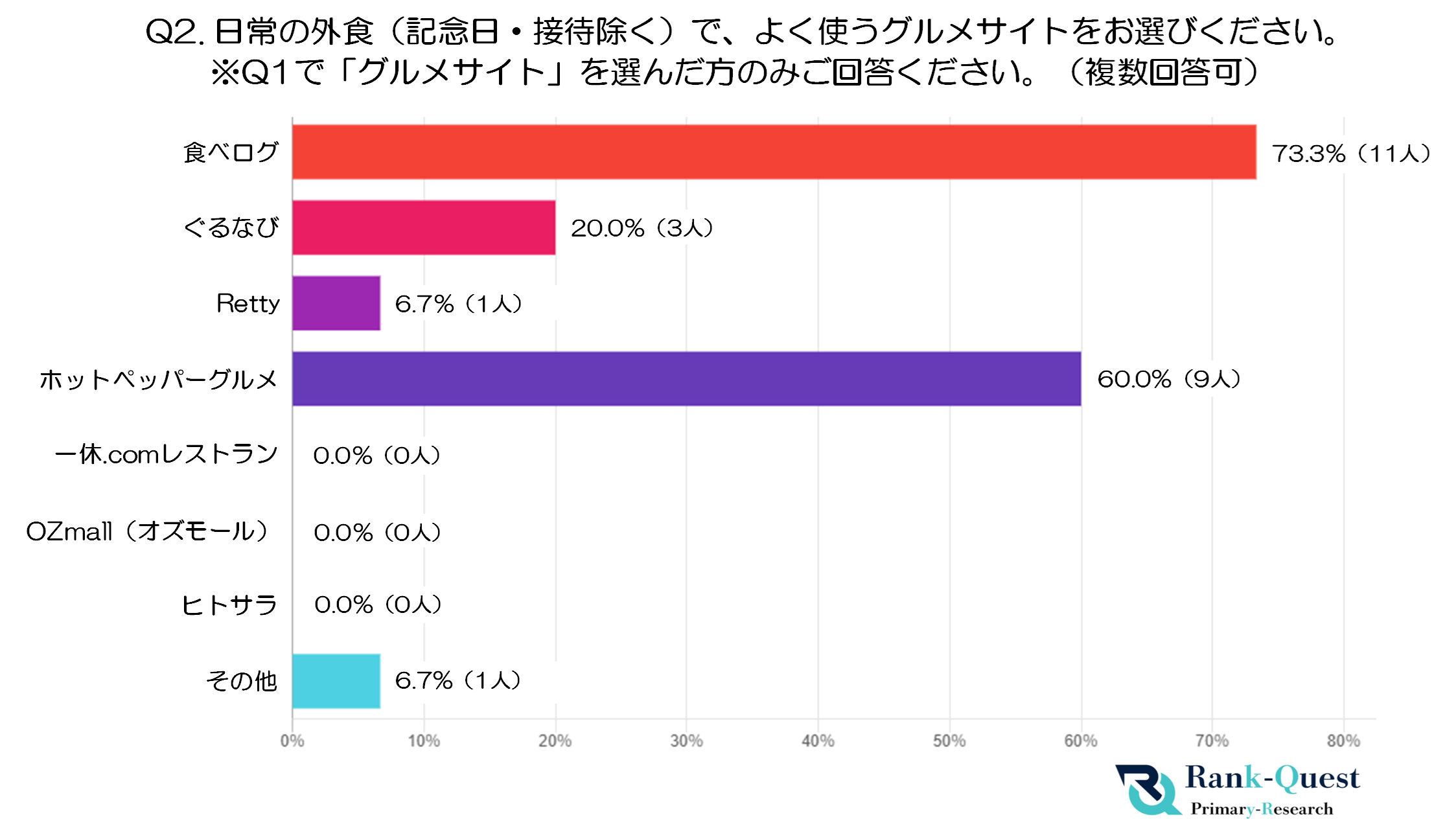 - 最も多かったのは「食べログ」で73.3%(11人)でした。口コミの圧倒的な件数と信頼感から、若年層においても"まずチェックする定番サイト"として根付いている様子が見て取れます。