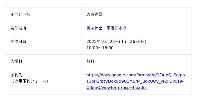開催の背景桃栗柿屋 (東近江本店:〒527-0042 滋賀県東近江市外町1381-3 )は、年に一度の大感謝祭を10月25日(土)・26日(日)に開催します。このイベントは、地域の皆様のご愛顧に対する感謝に基づいて企画されました。桃栗柿屋は、地域の皆様への日頃の感謝を通じて、新たなコミュニティの形成と交流の促進を目指しています。