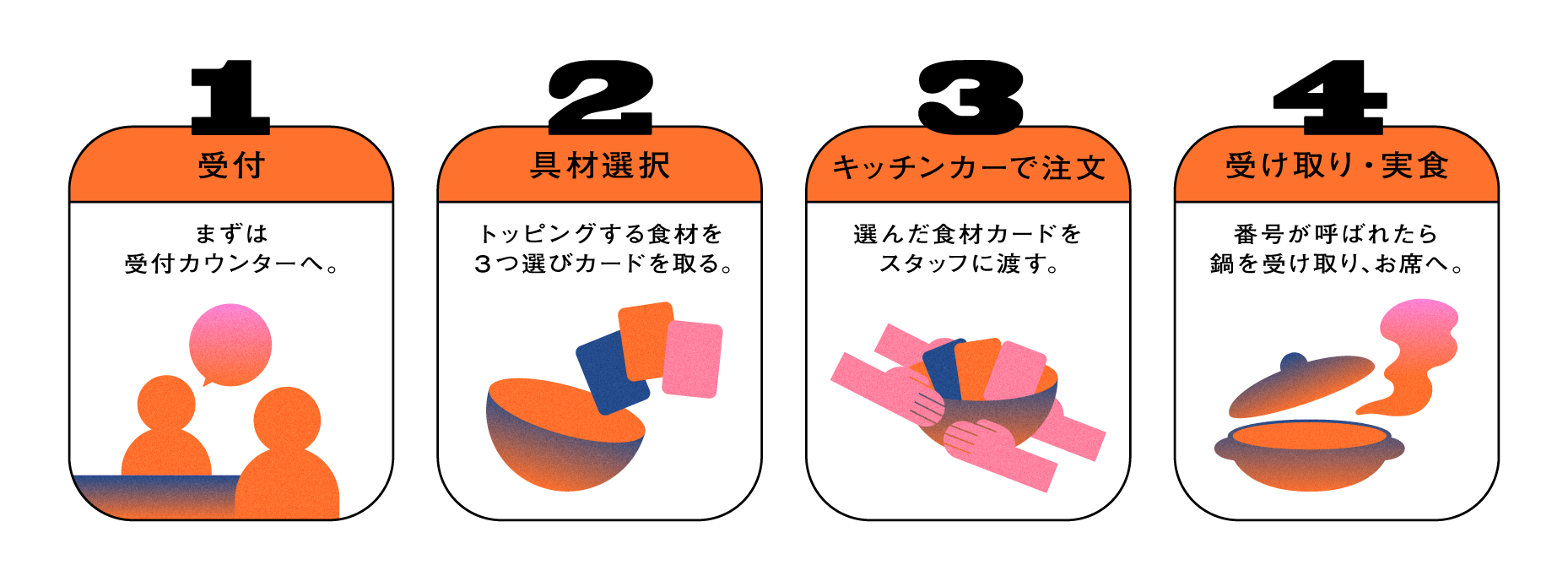 選んだ食材カードをスタッフにお渡しください。選んだ食材とベースの鍋出汁、お肉をキッチンカーで調理し、「もったい鍋」をご提供します。熱々の鍋をお楽しみください!