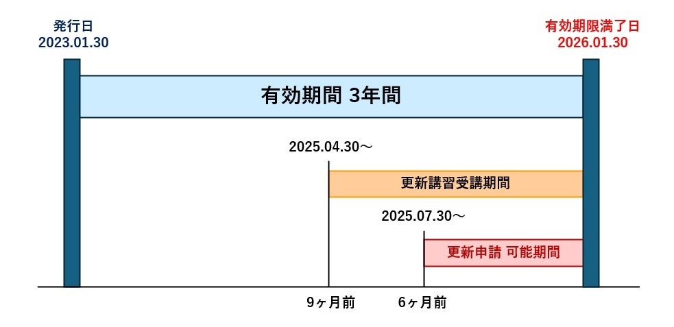 なお、更新講習は、「更新申請から3ヶ月前に修了したもの」までが有効であることから、有効期限満了日の9ヶ月前から受講が可能です。