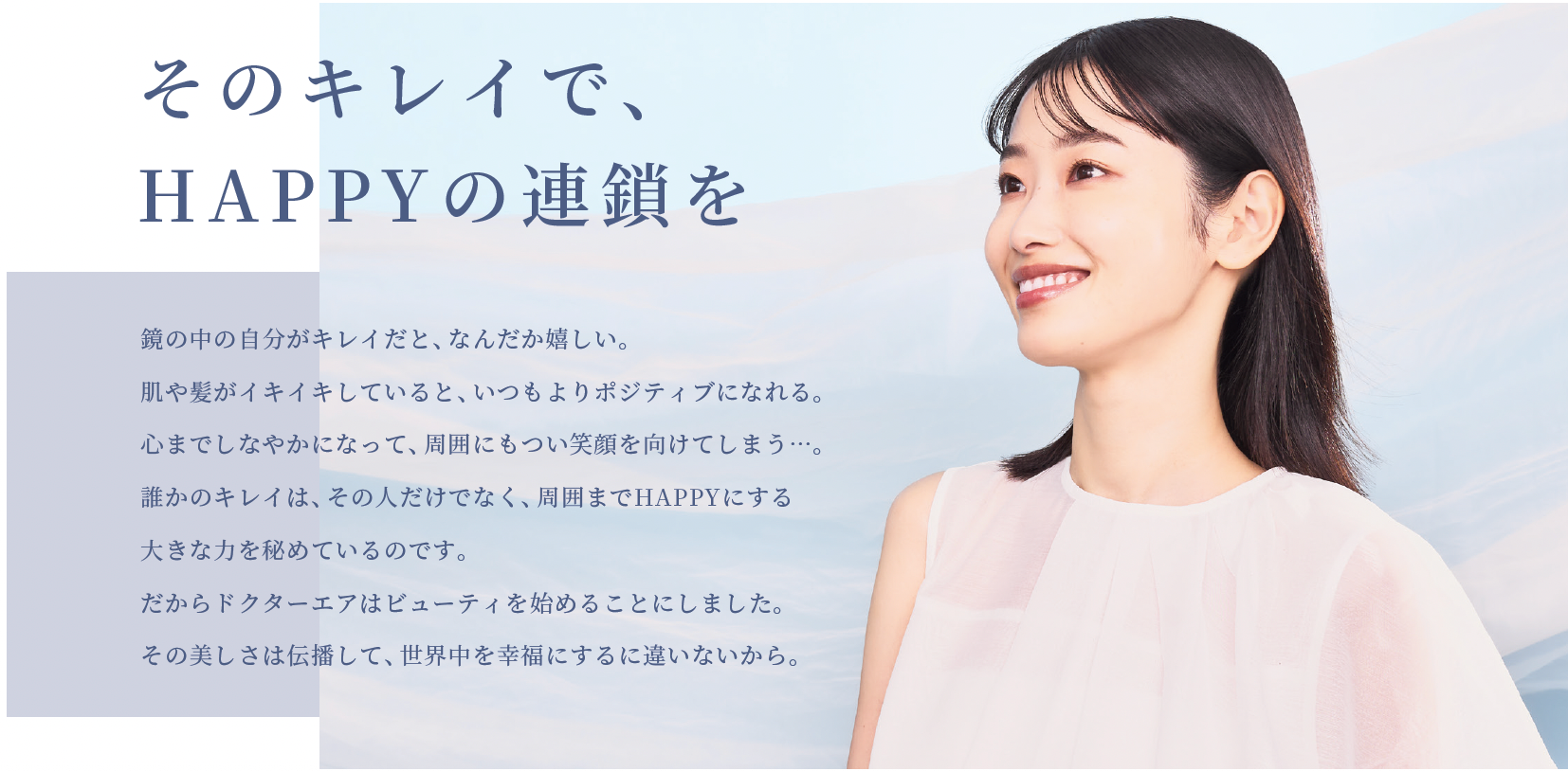 そんなドクターエアが満を持してスタートさせたのが、ドクターエア ビューティです。ビューティという新機軸で、これまで健康への関心が薄かった若年層、多忙なためケアの時間が捻出しづらい働き盛り世代、それに自分のケアが後回しになりがちな育児世代、難しいツールは使えないというシニア世代など、幅広い層にアプローチ。ビューティをきっかけに、すべての人を心身ともに美しく、よりHAPPYにし、そのHAPPYが社会へと広がっていく連鎖に貢献してまいります。