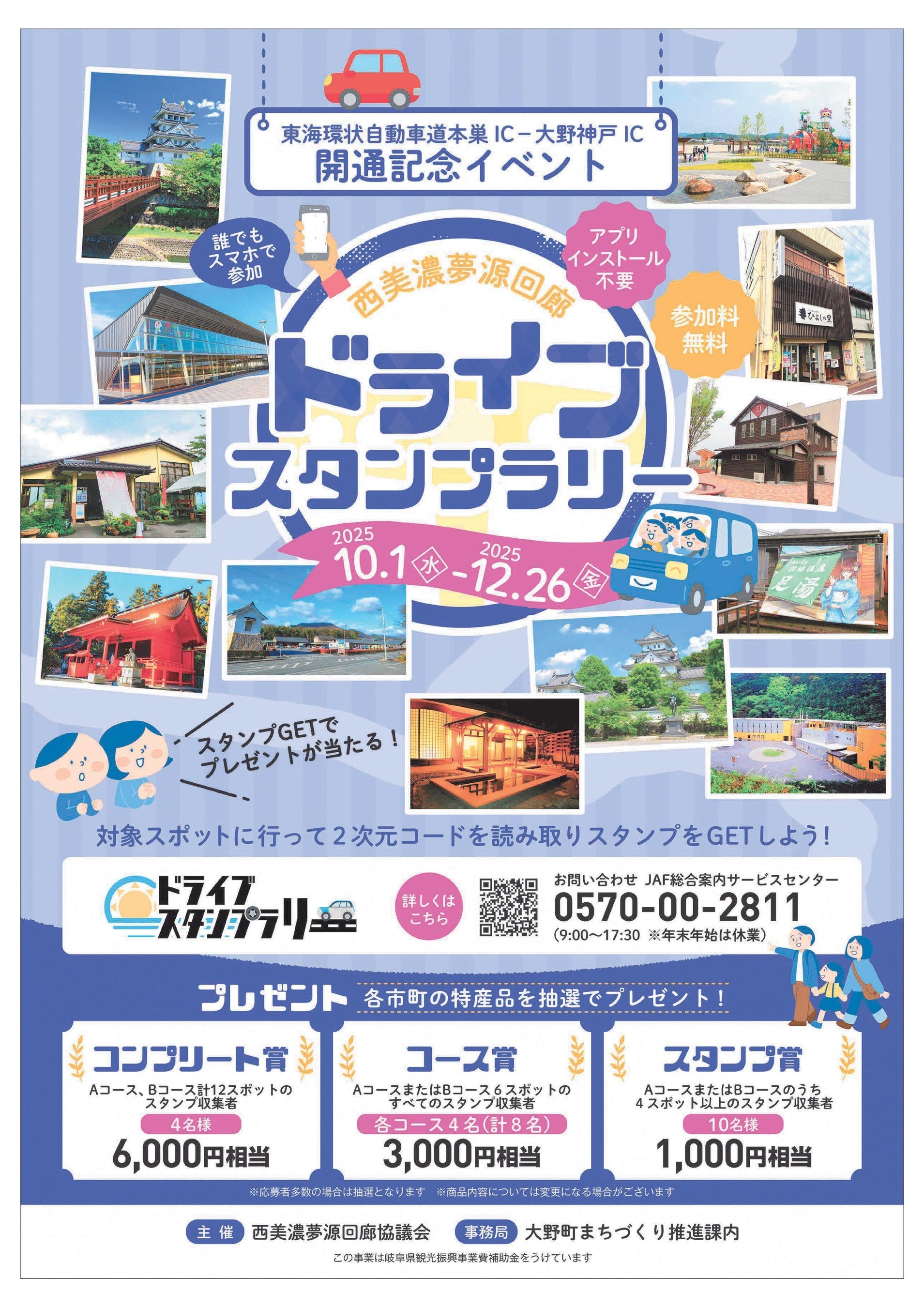 JAF(一般社団法人日本自動車連盟)岐阜支部(支部長 加藤元康)は、東海環状自動車道 本巣IC~大野神戸ICの開通を記念して、2025年10月1日(水)から開催している、2市4町(大垣市・本巣市・神戸町・大野町・揖斐川町・池田町)の「名所名跡・温泉・道の駅」などの魅力を再発見していただけるドライブスタンプラリー「西美濃夢源回廊(にしみのむげんかいろう)」(主催:西美濃夢源回廊協議会)の開催に協力しています。