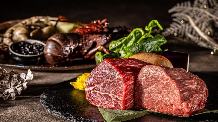 近江牛と米沢牛の希少部位シャトーブリアンの食べ比べ、伊勢海老(国産)、タラバガニなど、贅沢な食材の数々を堪能する鉄板焼きコース。