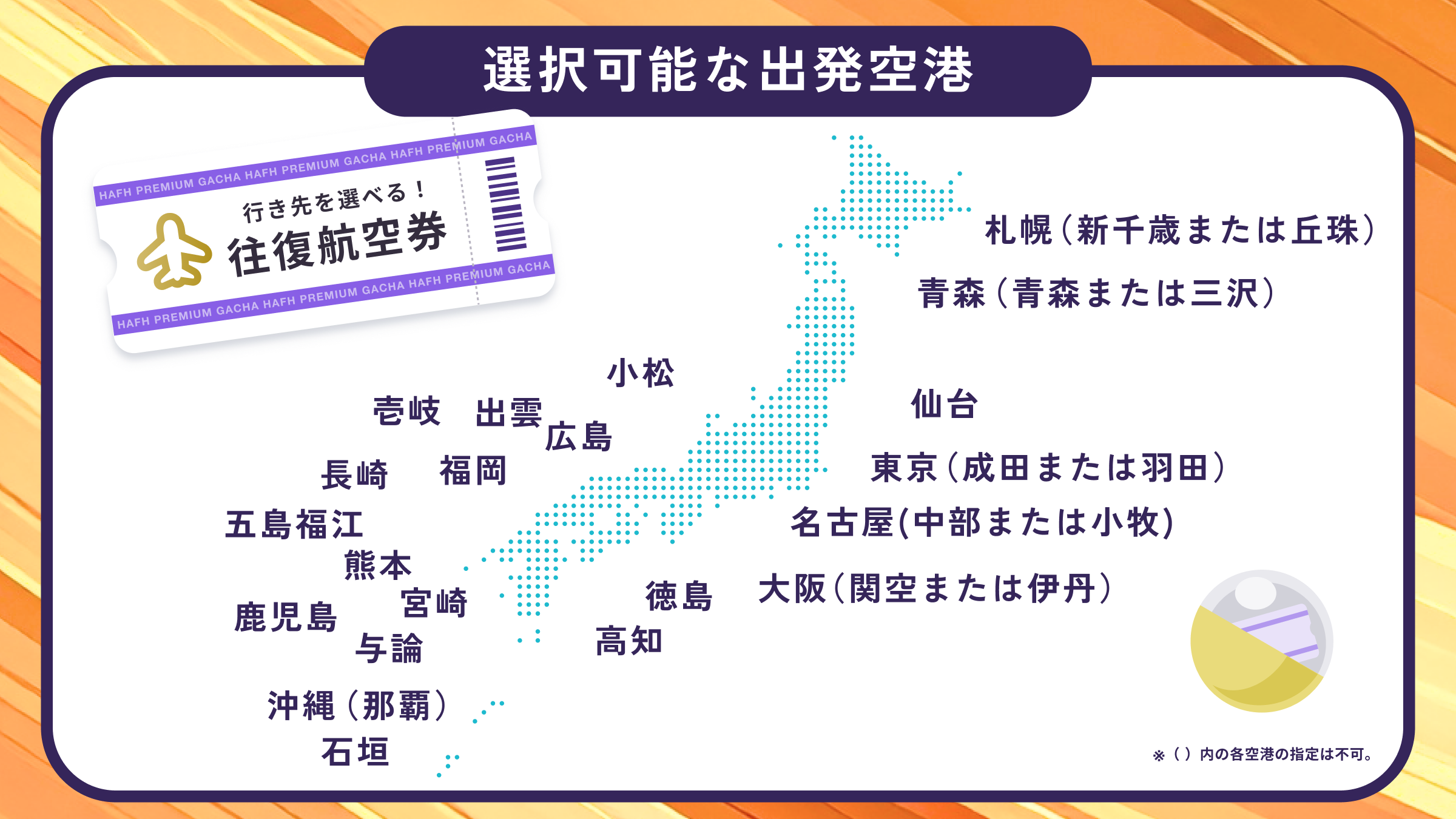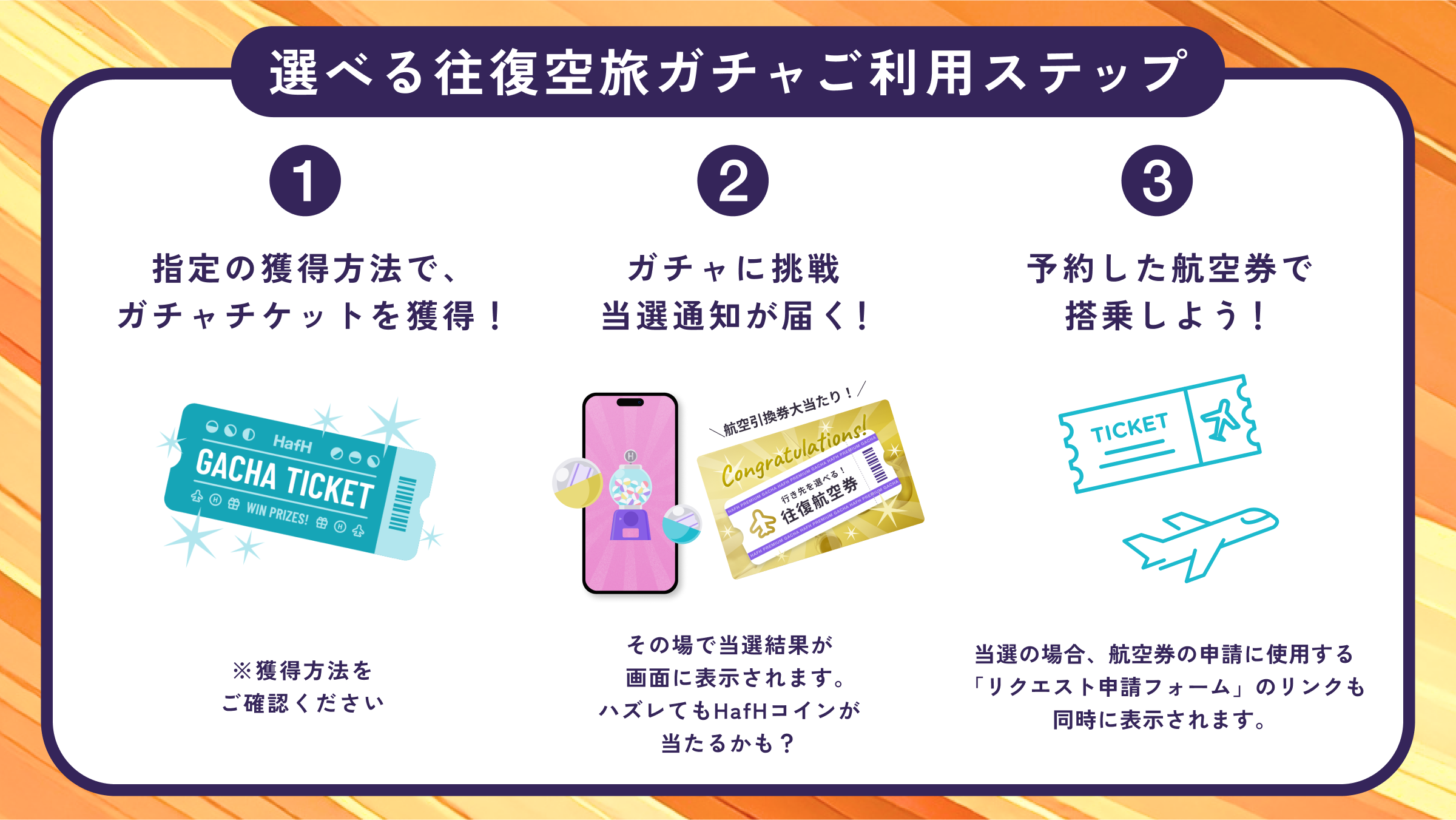 新規会員登録者限定で挑戦できる特別ガチャです。タップひとつで15%の確率で国内往復航空券(引換券)が当たります。さらに今回は、当選後に行き先も選択ができるため、当選後に表示される候補地リストを参考に、選ぶことも可能です。計画通りの旅だけではなく、HafHでしか味わえない、風まかせな旅の始まりを体験をご提供します。