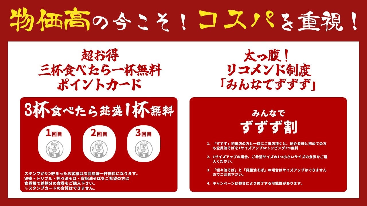 近年続く物価高の中、「油そば専門店ずずず」は「美味しい油そばを安くお腹一杯食べてもらう」ことを使命とし、顧客満足度を極限まで高めるお得な施策を導入しています。
