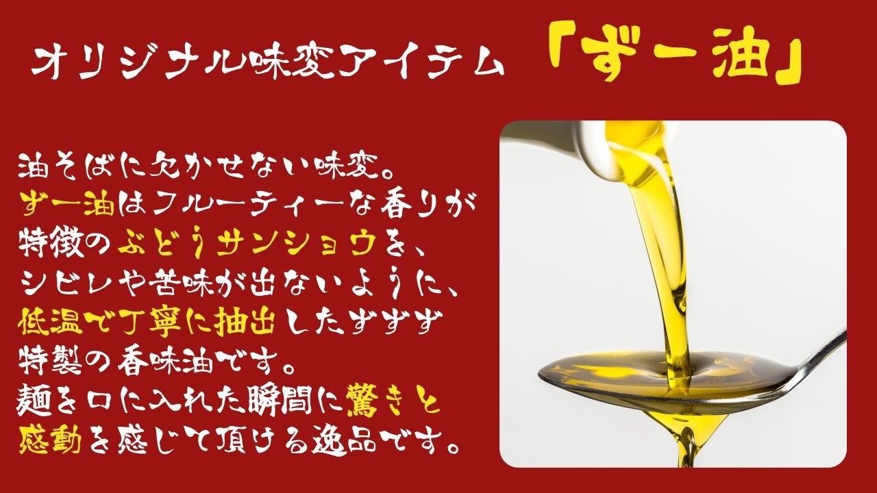 「油そば専門店ずずず」では、油そばの醍醐味である"味変"にもこだわっております。「ずずず」オリジナルの味変アイテム、その名も「ずー油」。フルーティーで爽やかな香りが特徴のぶどう山椒を、シビレや苦味が出ないように低温で丁寧に抽出した「ずずず」特製の香味油です。麺を啜った瞬間に驚きと感動を感じて頂ける逸品です。