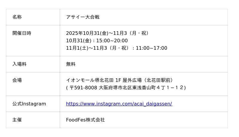FoodFes株式会社(代表取締役:稲垣一馬)は2025年10月31日(金)~11月3日(祝・月)の4日間「アサイー大合戦」をイオンモール堺北花田(大阪府堺市)の1F 屋外広場(北花田駅前)にて開催いたします。