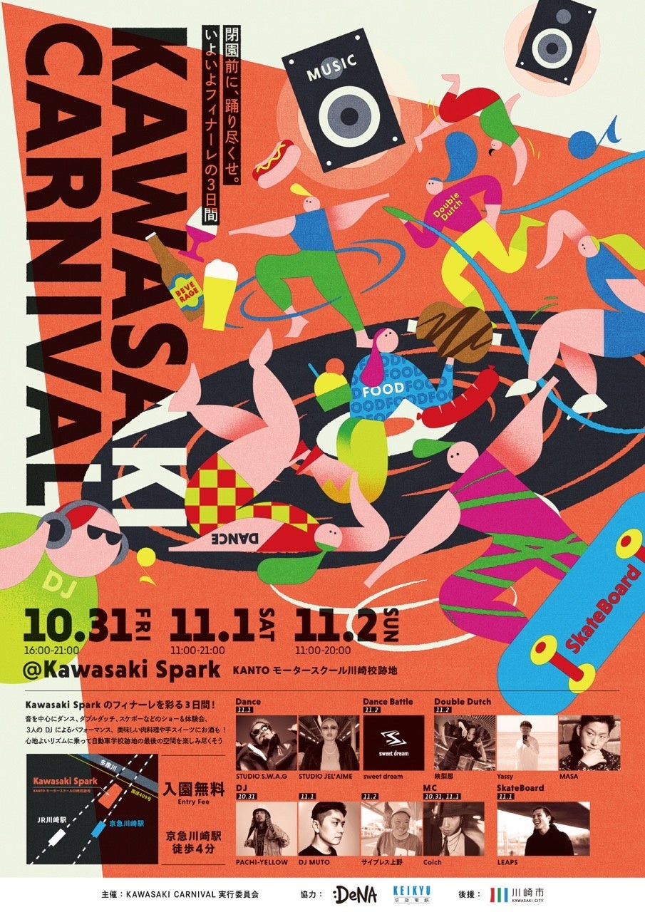 KAWASAKI CARNIVAL実行委員会(株式会社Color Create・西尾レントオール株式会社・FoodFes株式会社・株式会社with Create..<順不同>)は株式会社ディー・エヌ・エーおよび京浜急行電鉄株式会社の協力のもと、「Kawasaki Spark」のフィナーレを飾るスペシャルイベント、**『KAWASAKI CARNIVAL』**を開催いたします。
