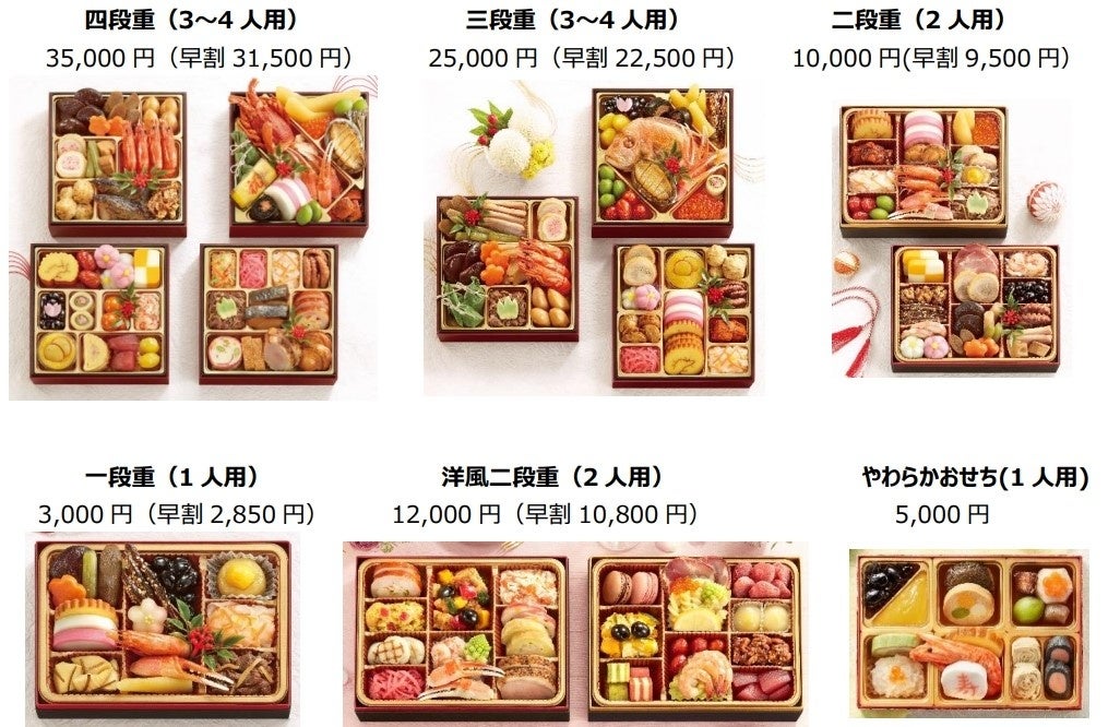 ご家族で年始を迎えられる方に向けた「四段重」「三段重」だけなく、単身世帯の方に向けた「一段重」、硬いものが食べにくくなった方でもおいしくお召し上がりいただける「やわらかおせち」など、幅広いラインアップが特徴です。
