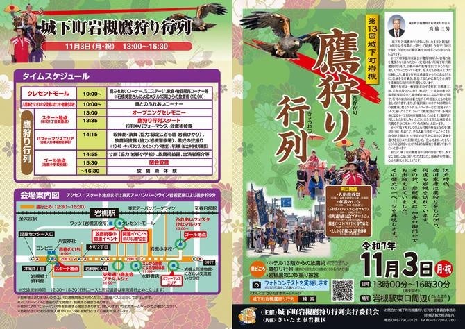 また、鷹匠による放鷹術を目の前で見られるのもこのイベントの魅力です。その他にも同日に「人形供養祭」「城下町岩槻鷹狩りマルシェ」「ふれあいフェスタ」「いわつき歴史散策スタンプラリー&マルシェチラシ 」「市宿のいち」「栄町通り商友会プチマルシェ」「えしかる岩槻「着物体験」 」も開催します。ぜひお越しください!