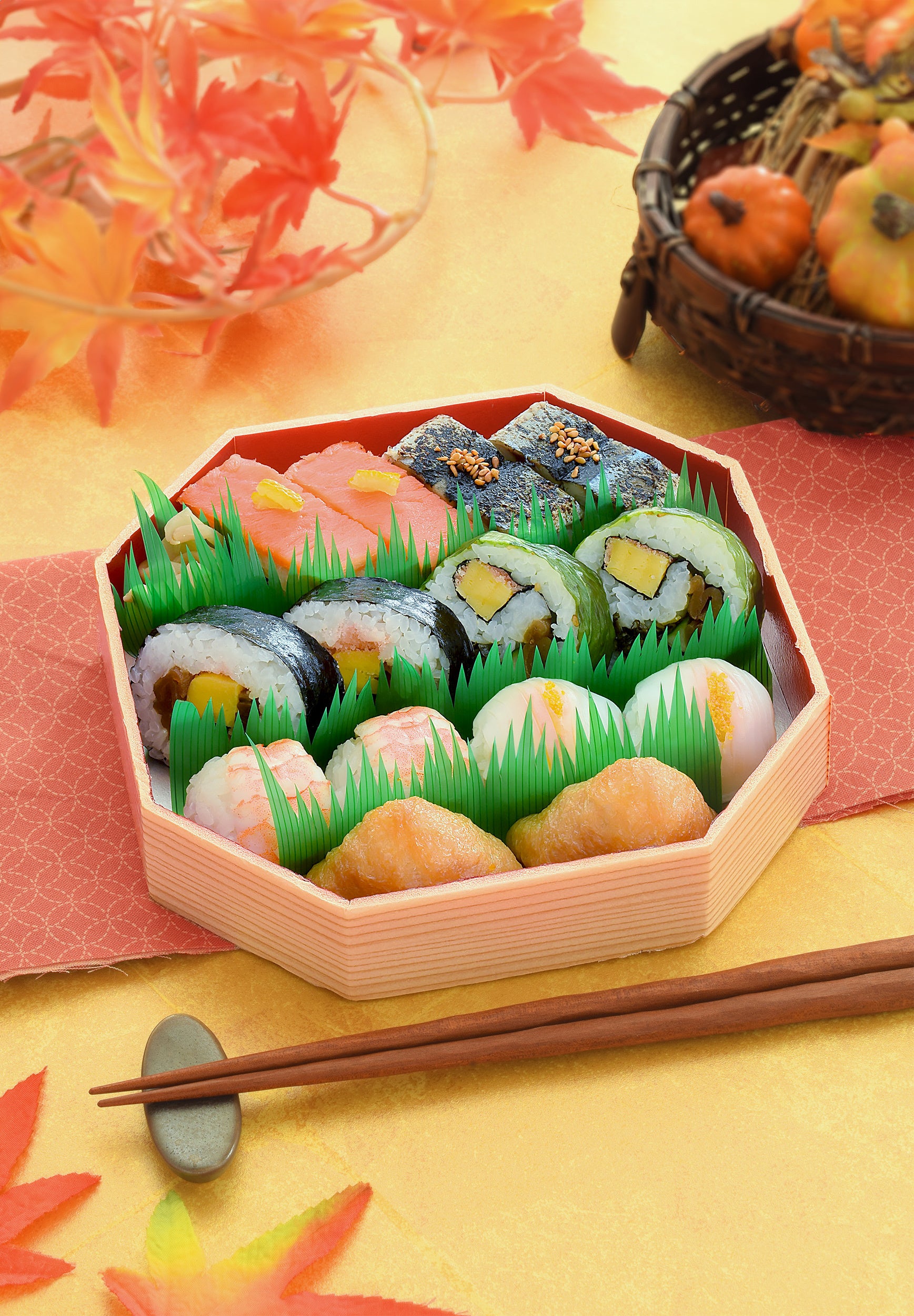 ◯具材内容:押寿司(炙り〆さんま・サーモン)、太巻、高菜太巻、てまり寿司(海老・やりいか)、
