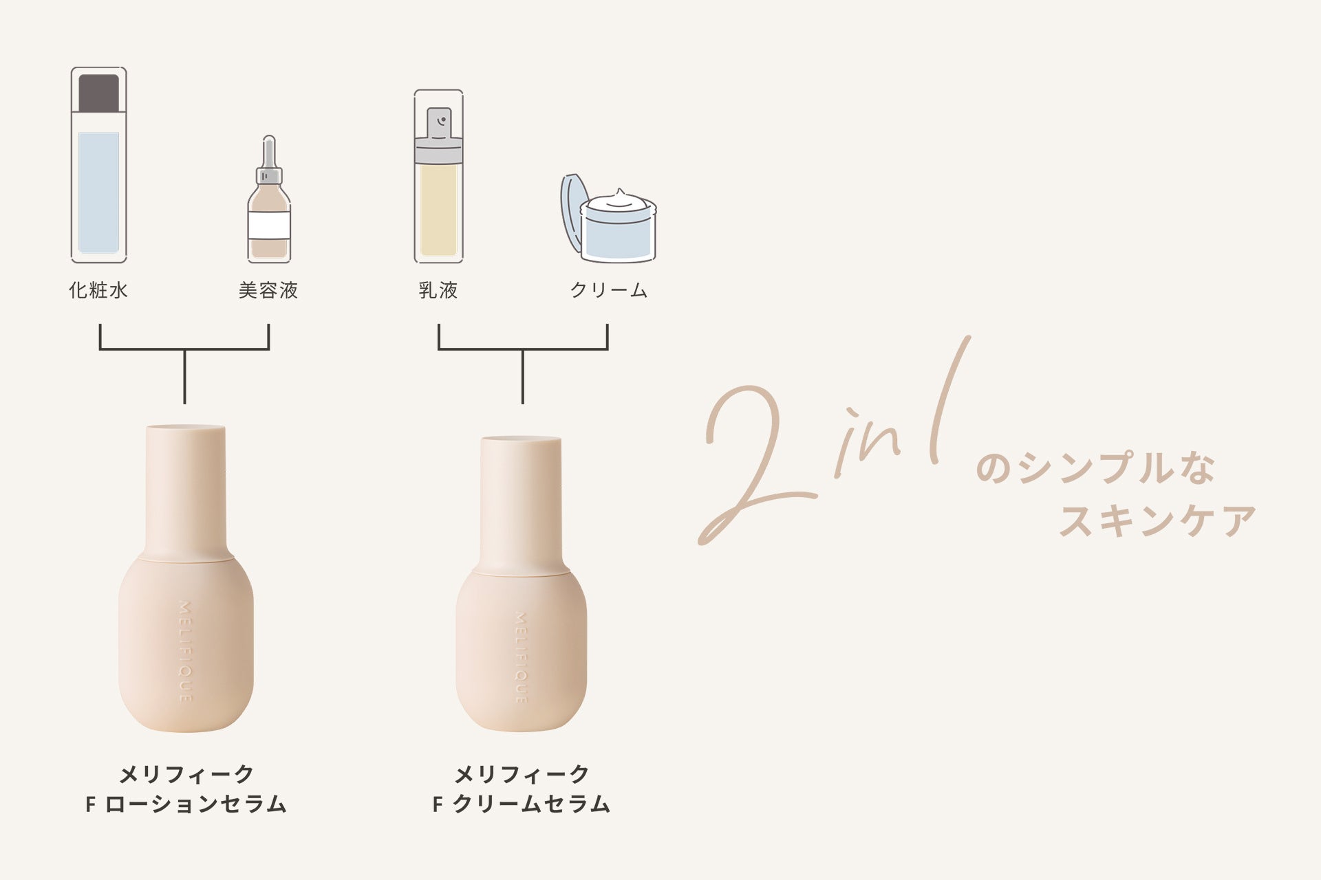 「化粧水×美容液」と「乳液×クリーム」の2製品でスキンケアが完了する、シンプルなステップを実現しました。忙しい毎日でも手軽に本格的なケアが可能です。