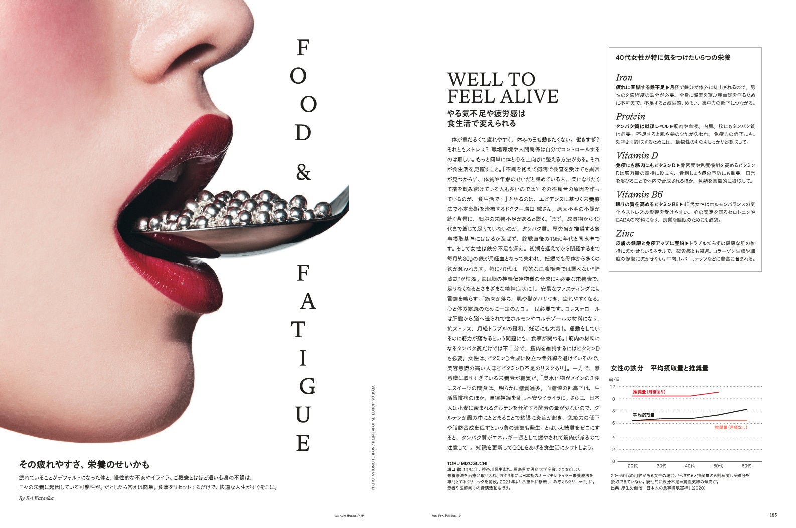FOOD & FATIGUE その疲れやすさ、栄養のせいかも慢性的な不安やイライラなど、疲れていることが当たり前になっている人は少なくありません。体質や年齢のせいだと諦めてしまいがちな心身の不調は、日々の栄養に起因している可能性があります。本特集では、特に気を付けたい5つの栄養素や、管理栄養士による時間と手間をかけすぎずに栄養価の高い食事を取り入れるコツのレクチャーなど、専門家による食生活を見直すためのメソッドを紹介します。
