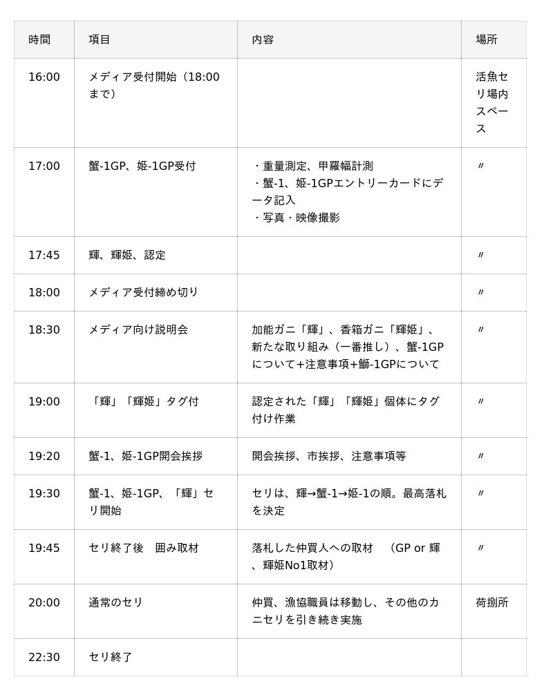 ※「蟹-1グランプリ」「姫-1グランプリ」の受付は17:00からとなりますが、カニの水揚げは16:00ごろから開始します。カニの荷卸しや漁港の様子をご取材いただく場合は、フォームにて記載の上、事務局まで事前にご連絡ください(水揚げの時間は当日の天候や漁模様により早くなる可能性があります)。
