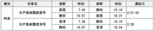 水戸偕楽園高尾・君津号◆「第130回水戸の梅まつり」開催にあわせて、偕楽園や弘道館へのお出かけに便利な臨時列車を運転します。早春の香り漂う梅の名所へ、週末のお出かけをお楽しみください