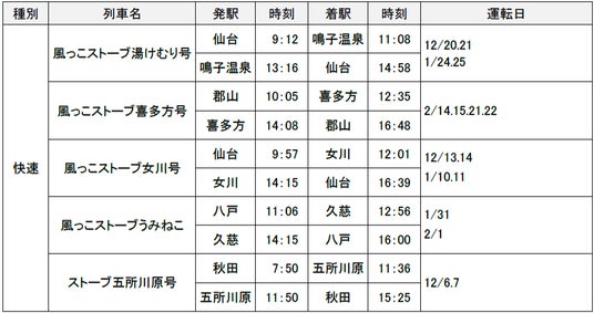 風っこストーブ湯けむり号・喜多方号・女川号・うみねこストーブ五所川原号◆昔懐かしい「だるまストーブ」を使用した臨時列車を東北各地で運転します。暖かい車内から沿線の冬景色をお楽しみください