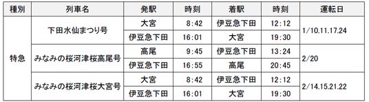 下田水仙まつり号 みなみの桜河津桜高尾・大宮号◆伊豆エリアの水仙や早咲きの桜の観賞に便利な臨時列車を運転します。一足早い春の訪れを感じる伊豆の旅をお楽しみください。