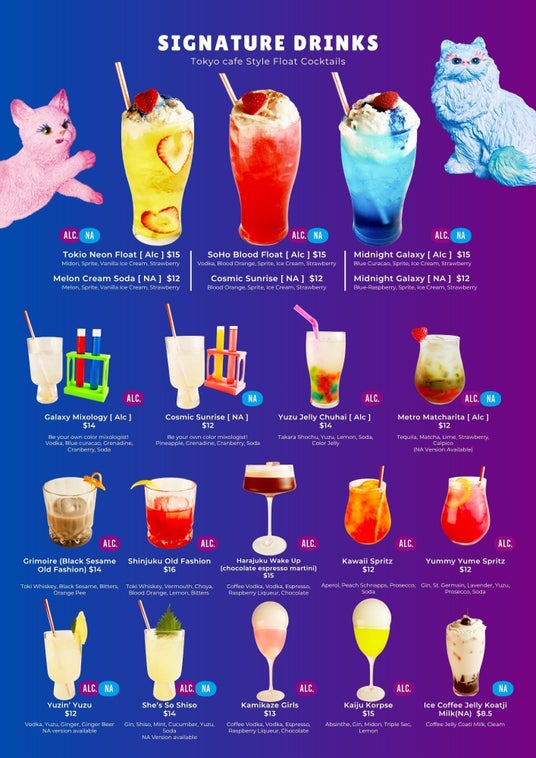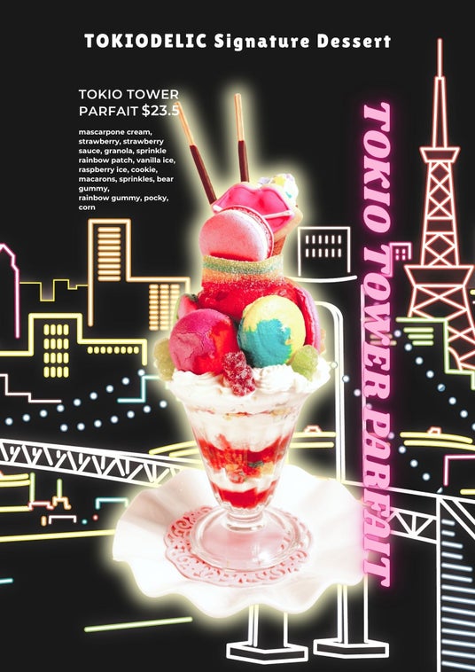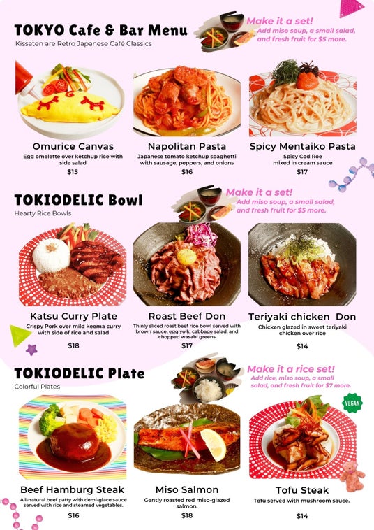 新たなフードコンセプトは "Tokyo Cafe and Bar"。日本ならではの喫茶文化を感じられるプリンアラモードや抹茶ラテ、コーヒーゼリーフロートに加え、おにぎりサンド、唐揚げ、オムライスなど、手軽に楽しめるオーセンティックな喫茶店メニューをラインナップしました。メニューから空間デザインにいたるまで、アーティスト増田セバスチャンがトータルで手がけ、 "Kawaii"と"イマーシブ"を融合した唯一無二の世界を創出。カラフルで夢のような空間の中で、懐かしさと新しさが交差する東京の「今」を体験できます。
