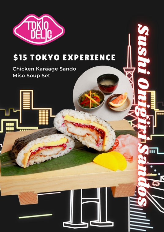 「物価上昇が続くニューヨークの街で、日常の中に"ちょっとした豊かさ"と"東京の彩り"を届けたい」、そんな増田セバスチャンの想いから誕生したのが、オープン期間限定の特別プラン 「15ドルの東京体験」 です。日本の唐揚げを酢飯でサンドした特製「おにぎりサンド」をメインに、味噌汁、サラダ、フルーツをセットで提供。インフレが続くNYの街で、手の届く価格で東京の味とカルチャーを楽しめる「身近な旅」として、TOKIODELICが提案する新しいフードエクスペリエンスです。