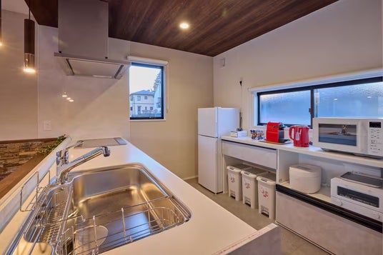 コーヒーメーカー、トースター、冷蔵庫、基本的な調理器具、炊飯器、電子レンジ、電気ポット、食器&カトラリー