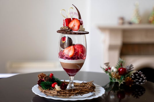 また、プレゼントボックスをイメージした季節限定パフェ「パルフェ・ド・ノエル ~ベリー&ショコラ~」には、洋酒や紅茶リキュールを効かせた大人の味わいと、ローズ香るジュレなど、華やかさを詰め込みました。