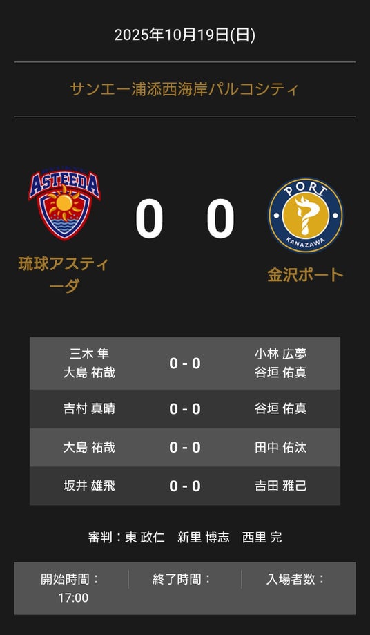 ノジマTリーグ 2025-2026 公式戦 10月19日開催 琉球アスティーダ vs 金沢ポート オーダー発表