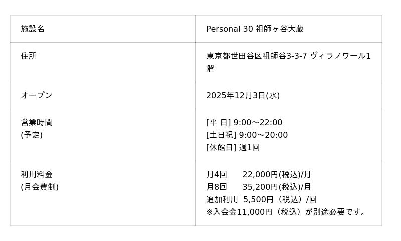 コナミスポーツ株式会社(以下、「弊社」)は、パーソナルトレーニングジム「Personal 30」の3店舗目を2025年12月3日(水)に祖師ヶ谷大蔵(東京都世田谷区)にオープンします。